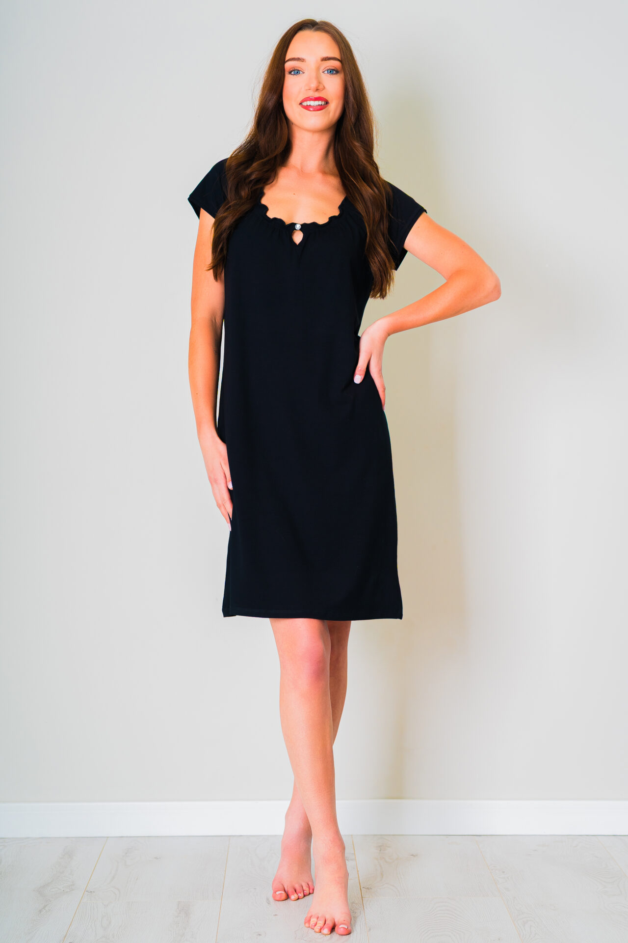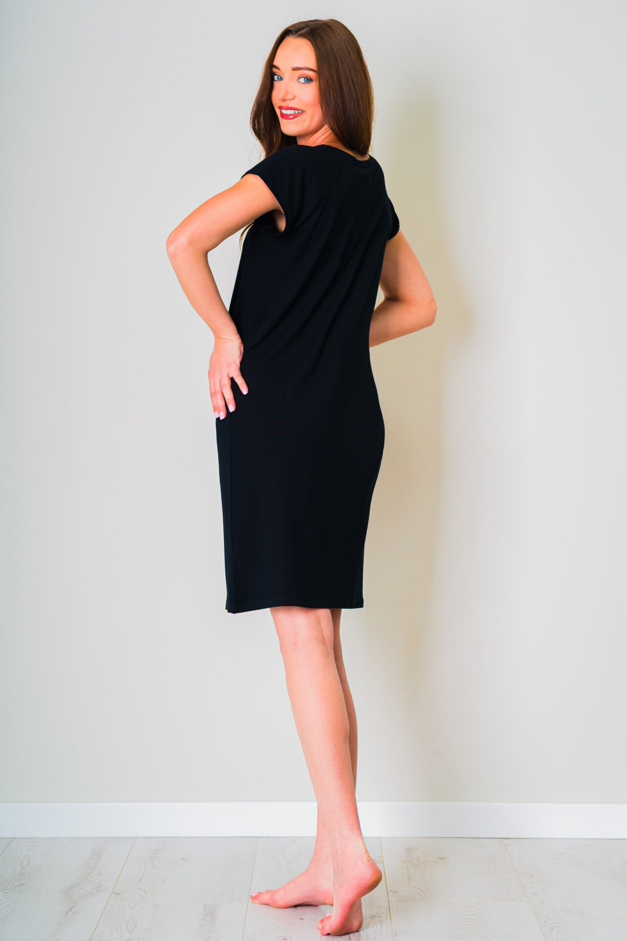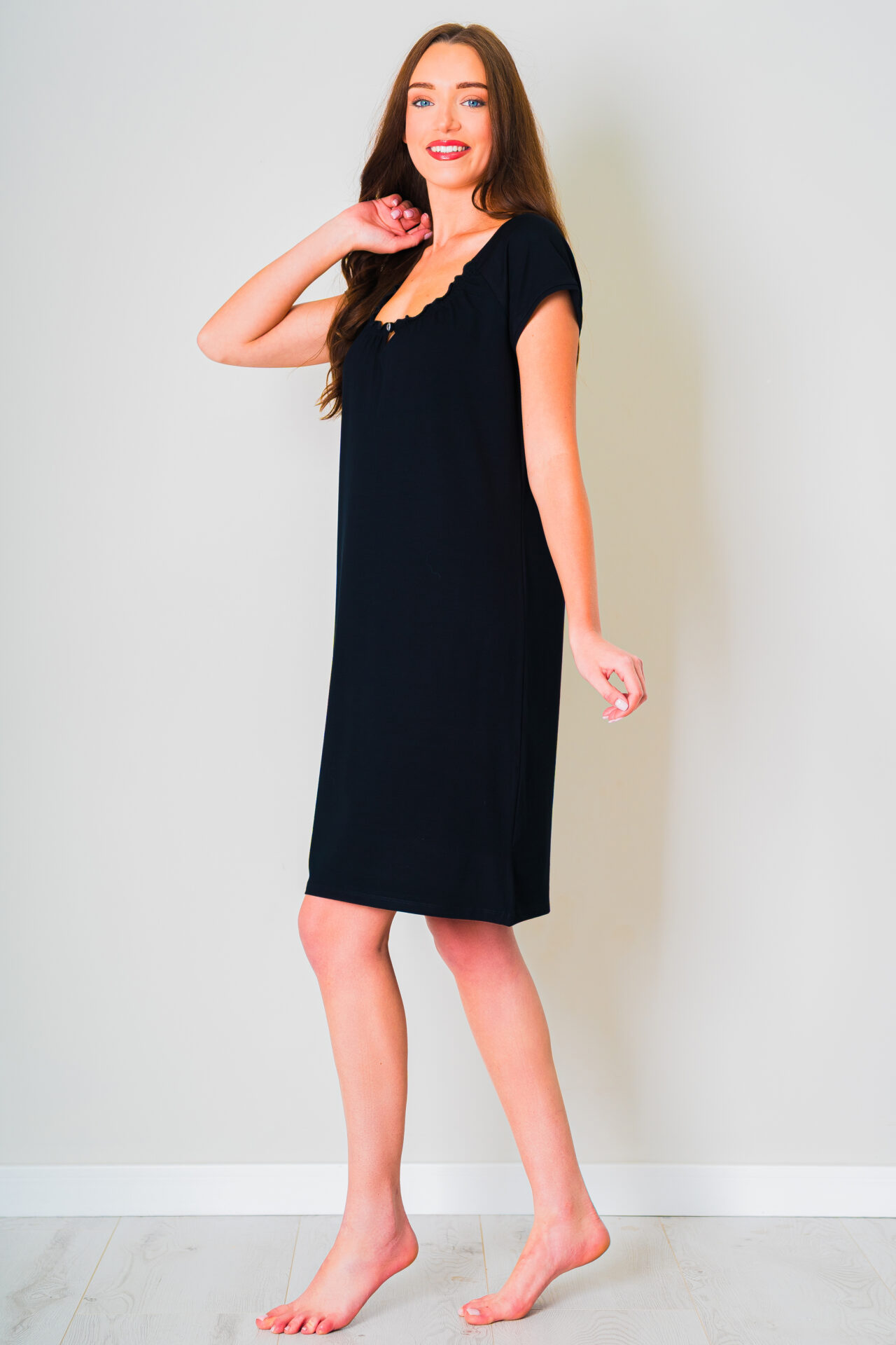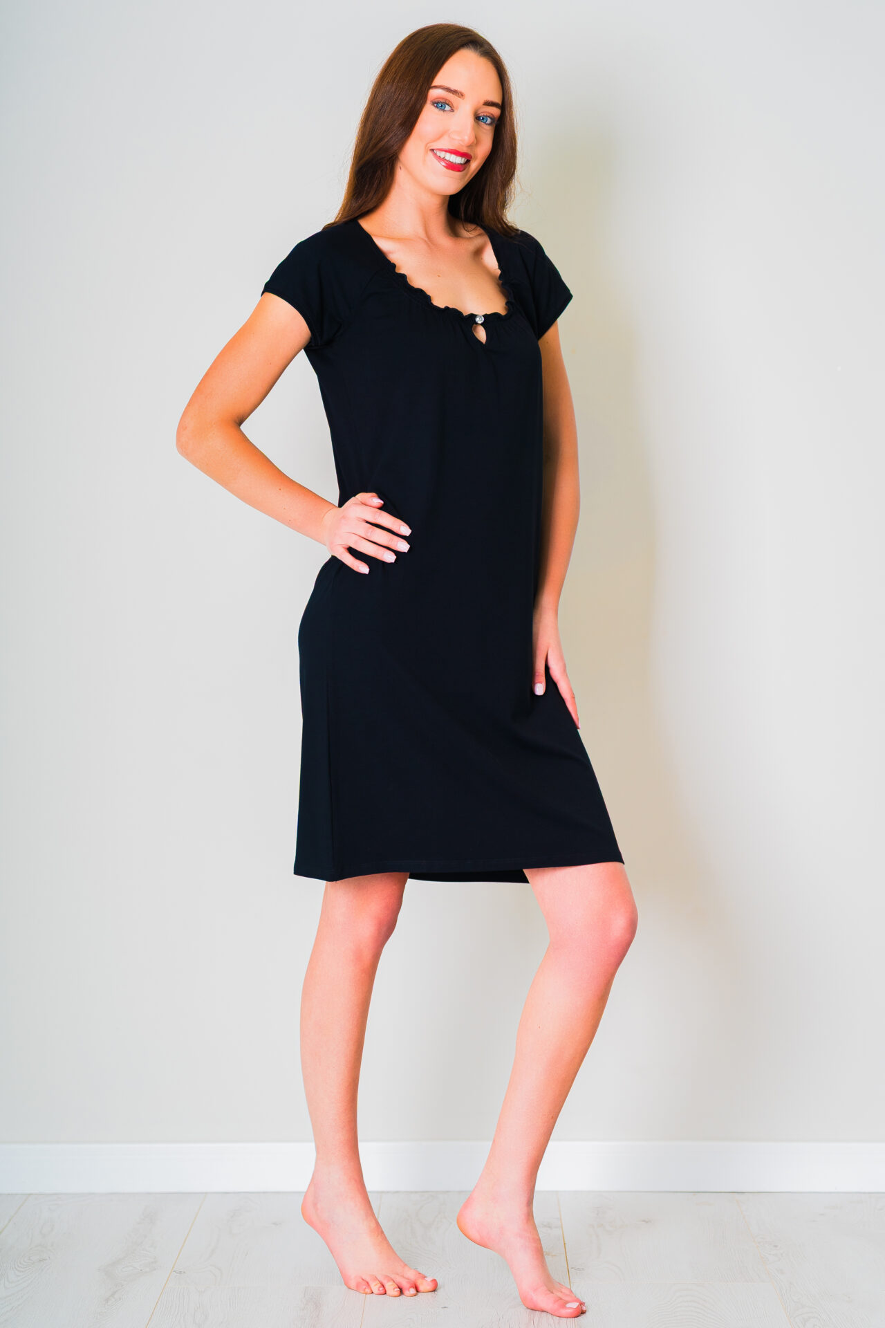 Prezentujemy mega produkt – koszula nocna z motylkowym rękawkiem ozdobiona przy dekolcie diamencikiem. Jest z wiskozy w kolorze czarnym. Diamentowy guziczek przy dekolcie pięknie rozświetla nocny strój dla zmysłowej kobiety.