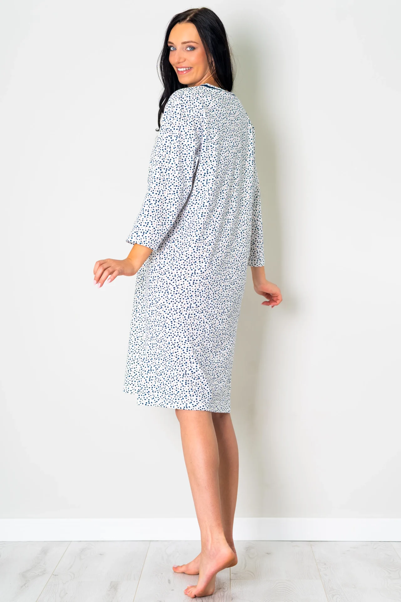 Klasyczna koszula biała w KROPECZKI z dekoltem w serek, tunika bawełniana z rękawem który sięga za łokieć. Koszula nocna nadaję się do spania jaki i do noszenia po domu. Posiada dekolt rozpinany wykończony delikatnym obszyciem. Biała koszula zadrukowana delikatnym printem w kropki, bardzo kobieca. Modny wzór i ciekawe zestawienie kolorystyczne. Tunika sięga do kolana, dzięki czemu masz swobodę poruszania się. Doskonale nadaje się dla każdej kobiety. Zapewnij sobie komfort snu oraz wysoką jakość noszenia. Tunika idealna również jako prezent.