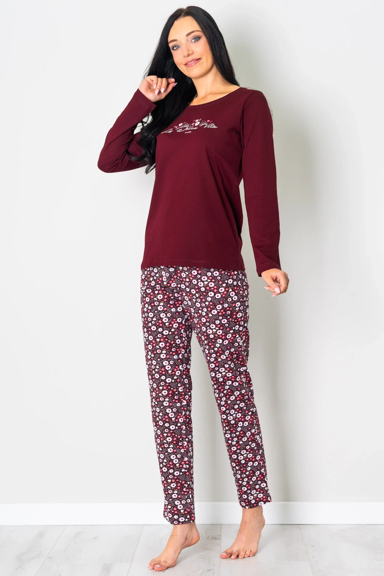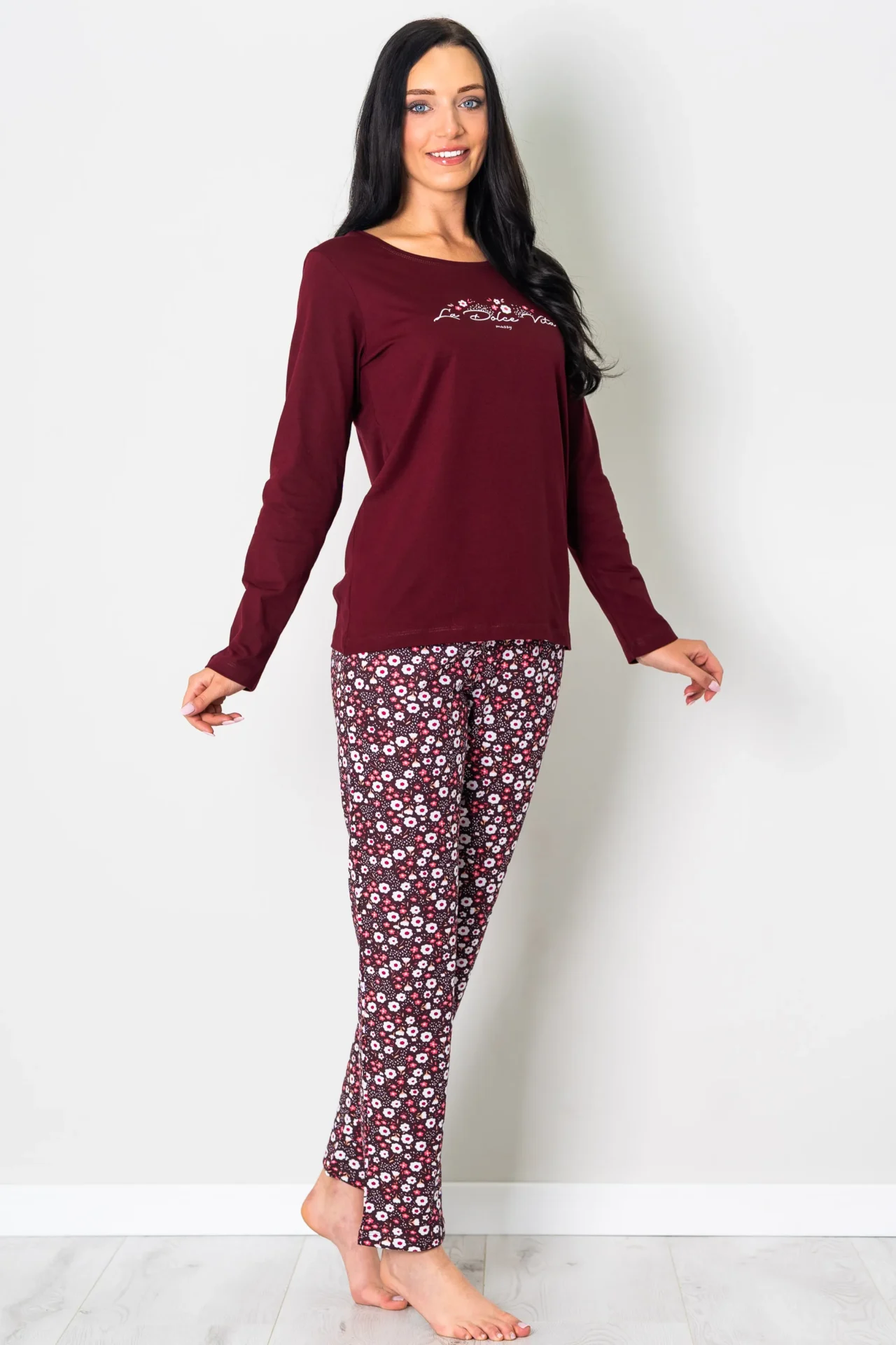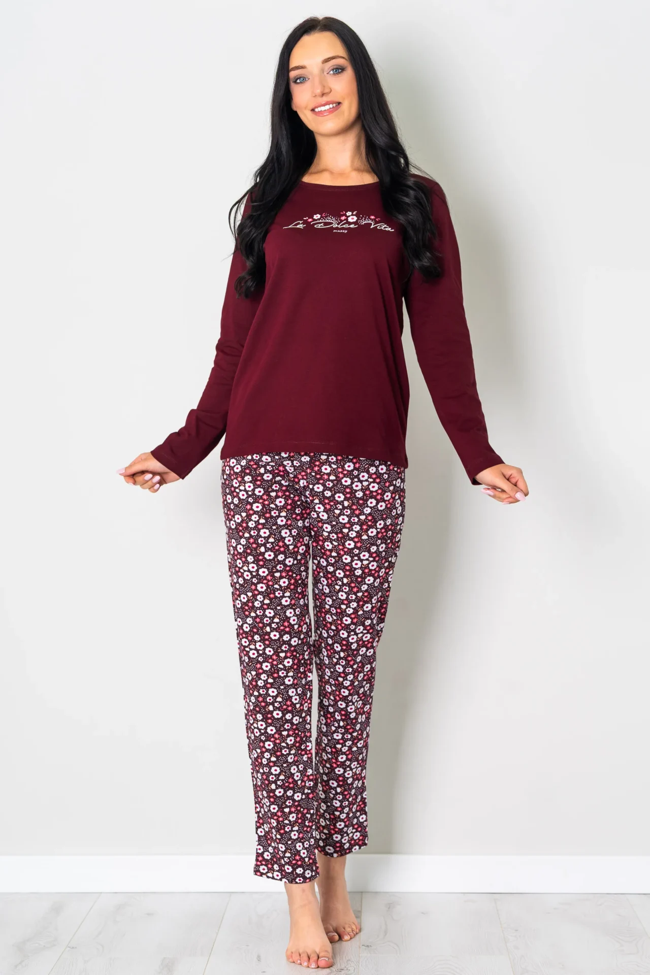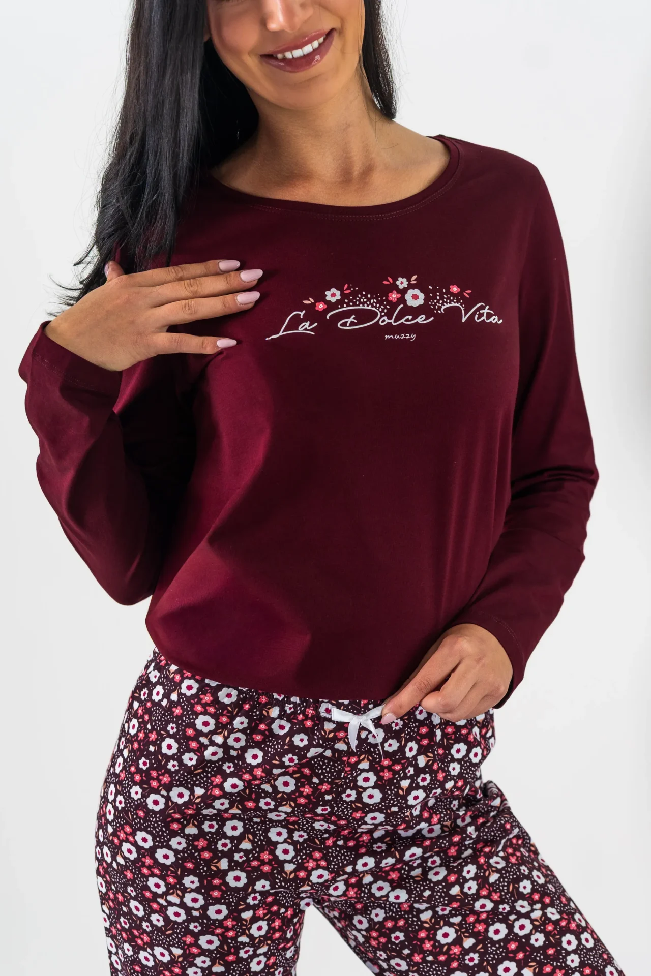 Piżama damska BORDOWY PORANEK długi rękaw i długie spodnie, to komplet dla miłośniczek aktualnych trendów i jesiennych kolorów. Ten komplet do spania z nadrukowanym delikatnym roślinnym printem i nadpisem ” La Dolce vita” to propozycja dla miłośniczek wygody. Bluzka w kolorze bordo świetnie współgra ze spodniami w podobnych odcieniach. Zestaw doskonały na jesienne wieczory jak i na prezent. Bluzka ma długi rękaw oraz okrągły dekolt, który zwiększa komfort noszenia. Do piżamy są dołączone wygodne długie spodnie z gumą. Piżama damska z bawełny 100%, polski producent Muzzy. Zapraszamy na nasz Instagram.