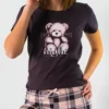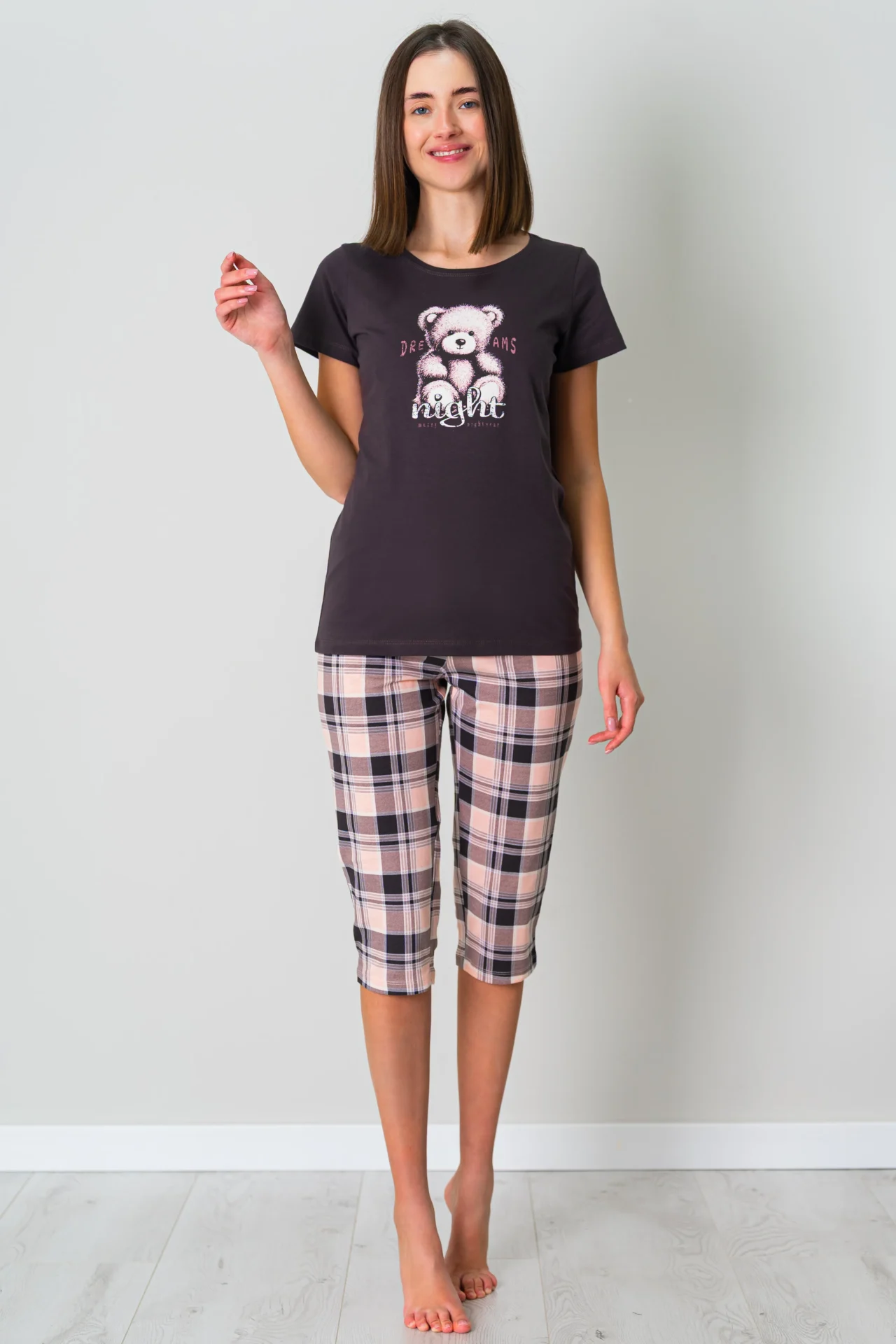 Piżama damska MIŚ krótki rękaw i spodnie 3/4 w kratę, to propozycja dla miłośniczek uroczych printów i modowych trendów. Ten komplet do spania to połączenie uroku, komfortu i wygody. Bluzka w kolorze brązu z nadrukowanych misiem i spodnie w różowo – brązową kratę tworzą świetne i urocze połączenie. Zestaw doskonały dla kobiet ceniących wygodę i komfort. Bluzka ma krótki rękaw oraz okrągły dekolt, który zwiększa komfort noszenia. Do piżamy są dołączone wygodne długie spodnie z gumą. Piżama damska z bawełny 100%, polski producent Muzzy. Zapraszamy na nasz Instagram.