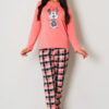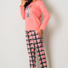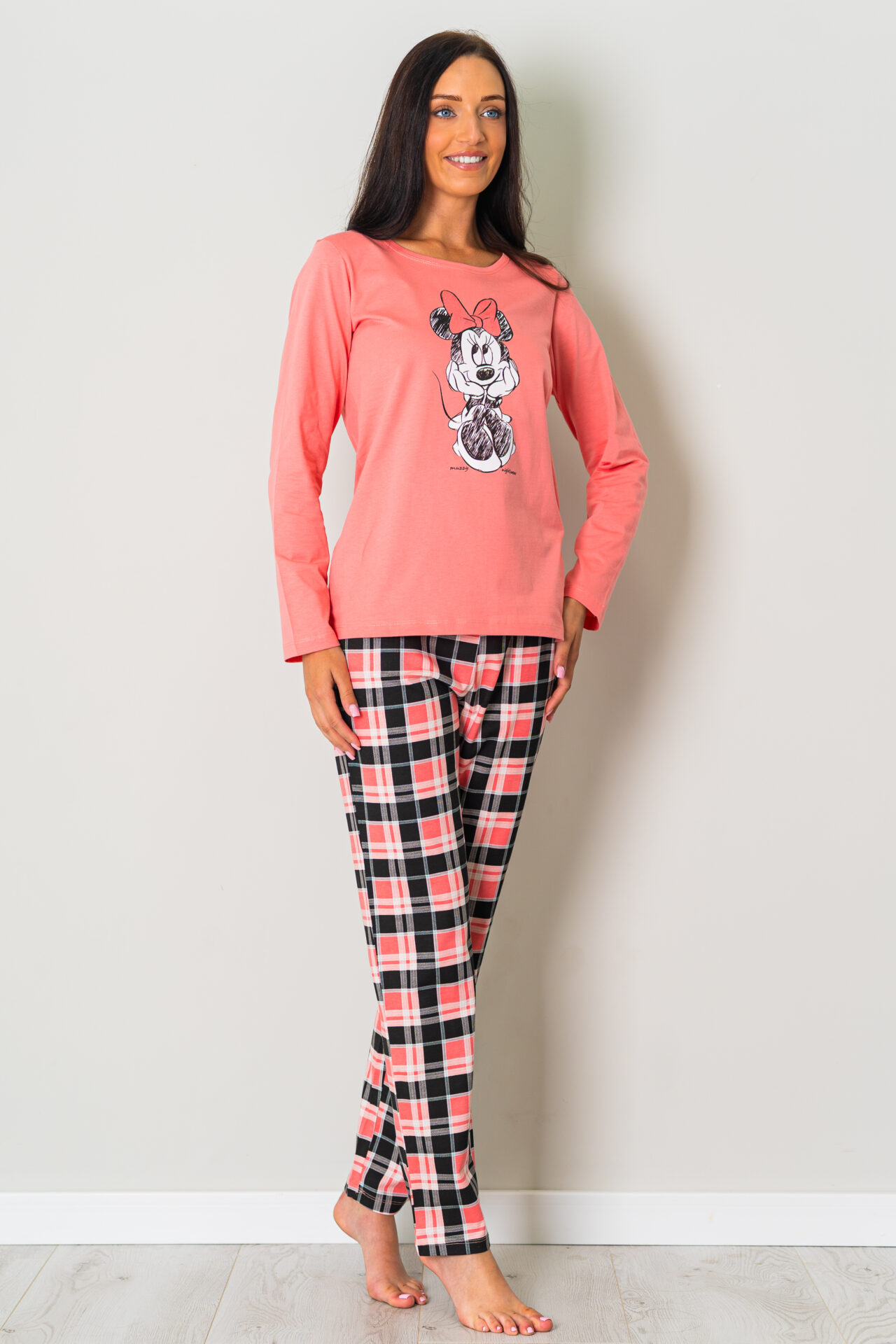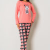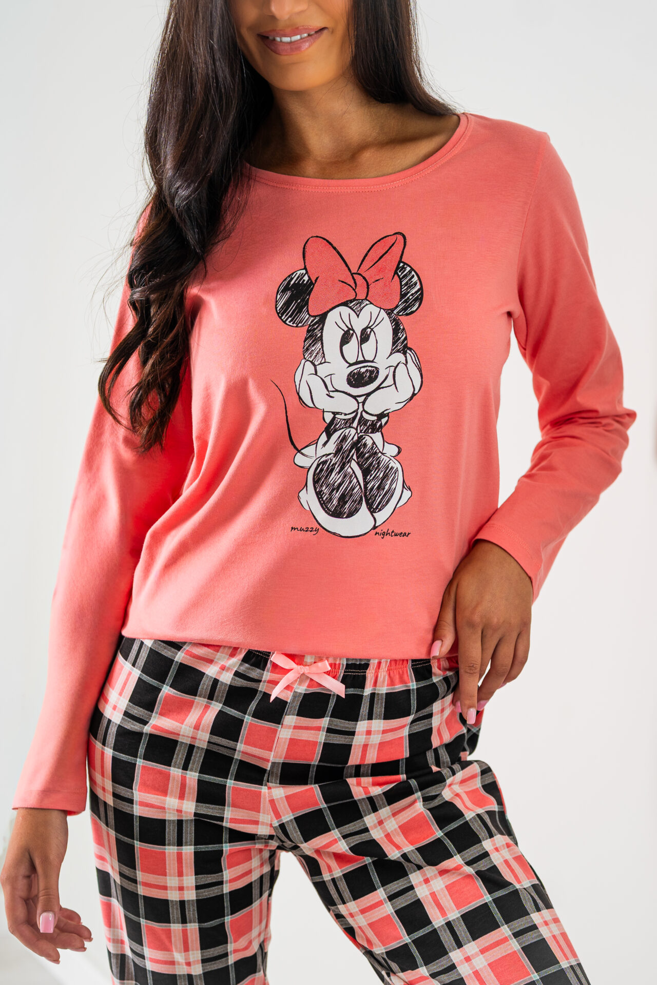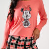 Piżama damska MYSZKA MIKI długi rękawek i długie spodnie to piękny komplet z nadrukiem wesołej Myszki Miki. Koszulka na długi rękawek w odcieniu morelki i dekolt okrągły. Na koszulce widnieje nadruk Myszki. W komplecie są spodnie długie całe zadrukowane w kratkę kolorysycznie dopasowaną do koszulki, przy gumce przyozdobione delikatną kokardką. To świetny pomysł na prezent dla niej. Piżama muzzy nightwear polskiej produkcji. Kolekcja jesień – zima 2025 r.