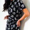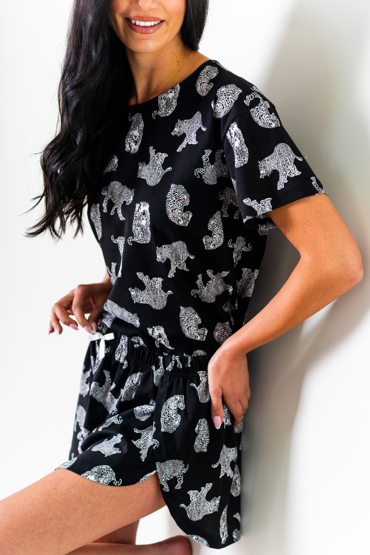 Odkryj wyjątkową piżamę damską, która łączy w sobie komfort, elegancję i subtelny urok. Komplet damski składa się z koszulki na krótki rękawek, z okrągłym dekoltem. Koszulka w kolorze czarnym została zadrukowana w pantery. Szorty doskonale komponują się z całością, tworząc elegancki komplet. Całość została uzupełniona delikatną kokardką. To doskonała propozycja na prezent dla niej. Poczuj się pięknie i kobieco w naszym komfortowym zestawie muzzy nightwear! Piżama polskiej produkcji.