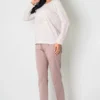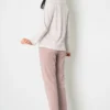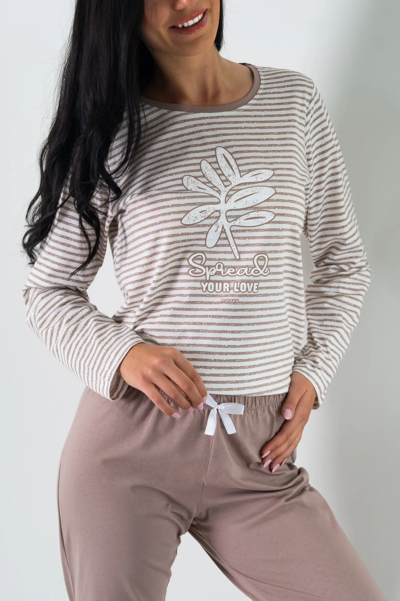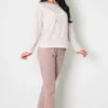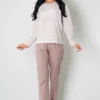 Spodnie długie w kolorze beżowym doskonale komponuje się z całością. Posiadają subtelną, kremową kokardkę. Dostępne w rozmiarach od M do XL, nasza piżama jest dopasowana do różnych sylwetek, zapewniając wygodę każdej kobiecie.