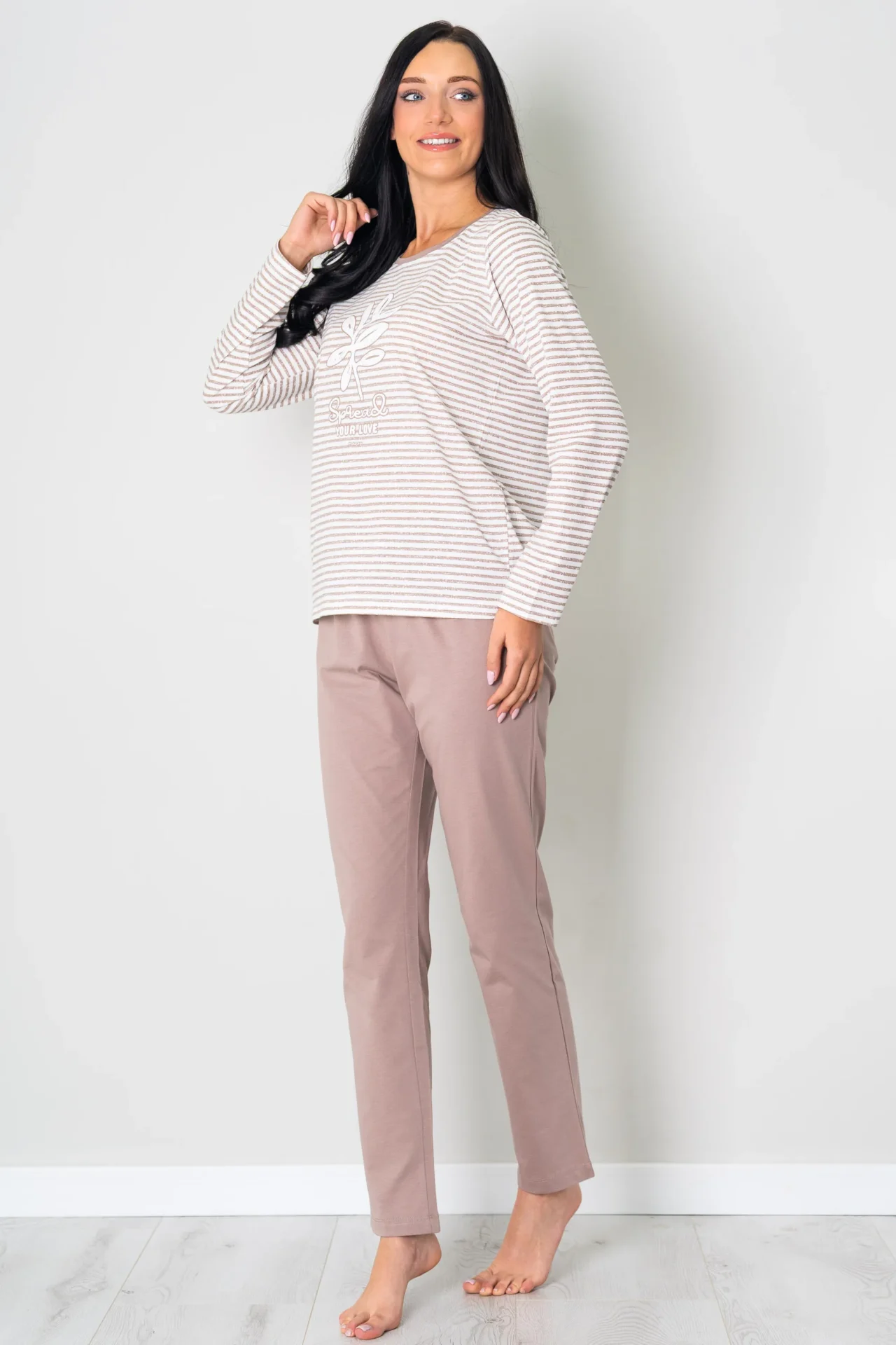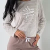 Piżama damska PASKI długi rękaw i długie spodnie beżowa. To wyjątkowa piżama damska, która łączy w sobie komfort, elegancję i subtelny urok. Nasza piżama w kolorze białym z beżowymi paseczkami z nadrukiem liścia to idealny wybór na spokojne wieczory i relaksujące noce.