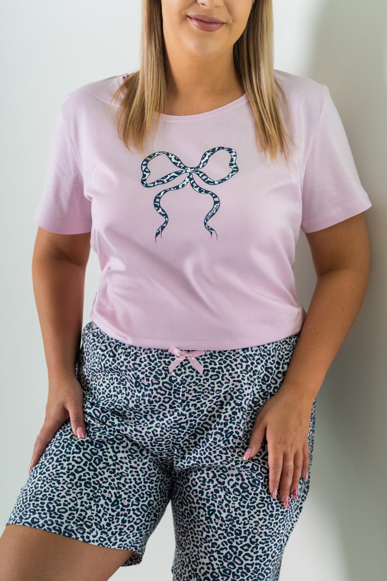 Piżama damska różowa KOKARDKA szorty to wygodny komplet na krótki rękawek oraz spodnie szorty. Koszulka posiada okrągły dekolt który zwiększa komfort noszenia, oraz dziewczęcy print w kokardkę. W skład kompletu wchodzi t-shirt i krótkie spodenki w całości zadrukowane panterką. Szorty posiadają gumę w pasie oraz uroczą kokardkę. Całość świetnie się komponuje, tworząc wyjątkowy komplet damski do spania. Piżama damska z bawełny 100%.