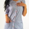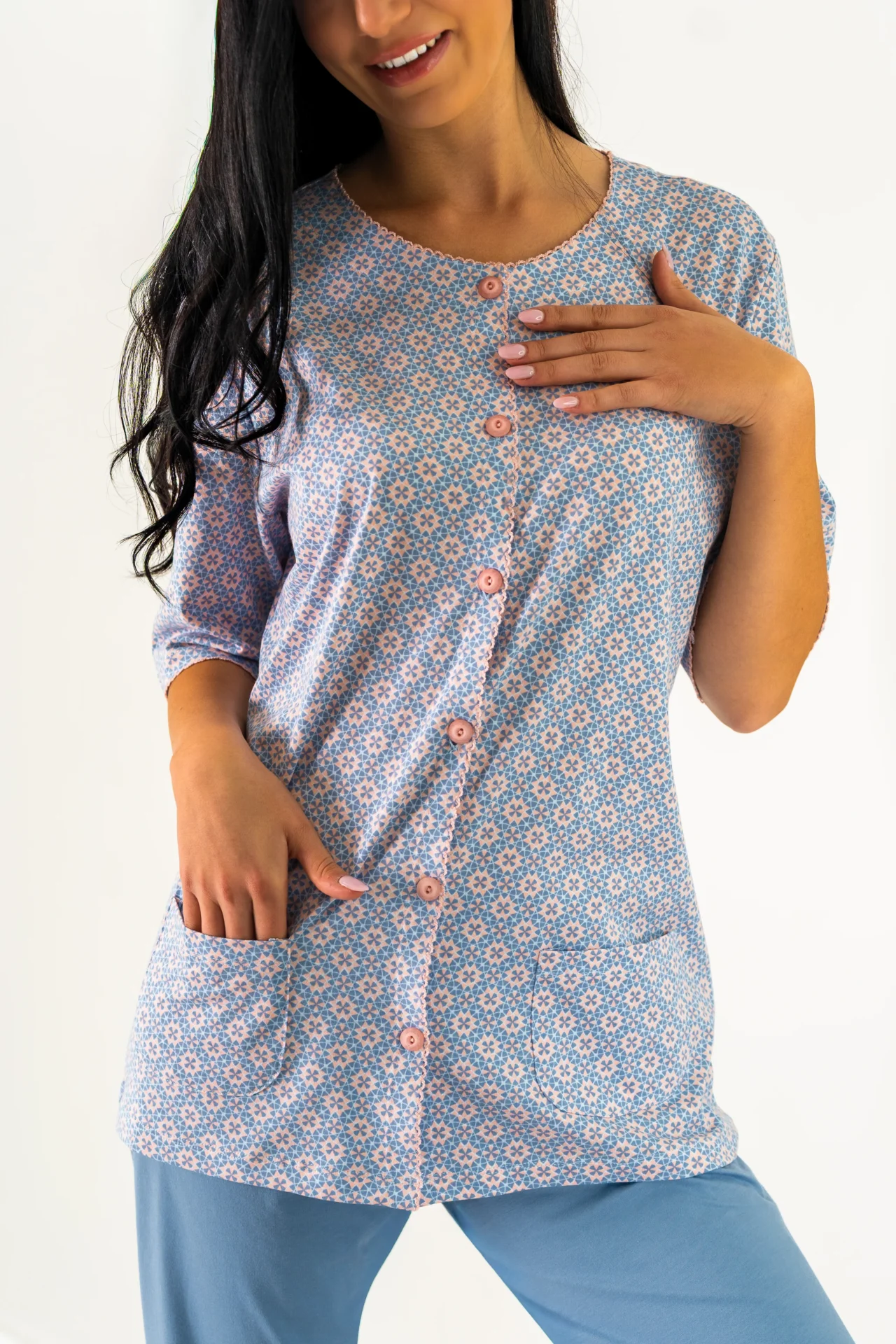 Odkryj wyjątkową piżamę damską, która łączy w sobie komfort i niepowtarzalne wzornictwo. Nasza piżama w kolorze błękitu z delikatnymi geometrycznym printem to idealny wybór na spokojne wieczory i radosne poranki. Rozpinana bluzka wyposażona w kieszenie i krótki rękaw to praktyczne i stylowe rozwiązanie. Dodatkowo, bluzka zdobiona jest delikatnymi obszyciami, co nadaje całości unikalnego charakteru. Gładkie długie spodnie w kolorze błękitu doskonale komponują się z mozaikową górą tworząc zestaw idealny.