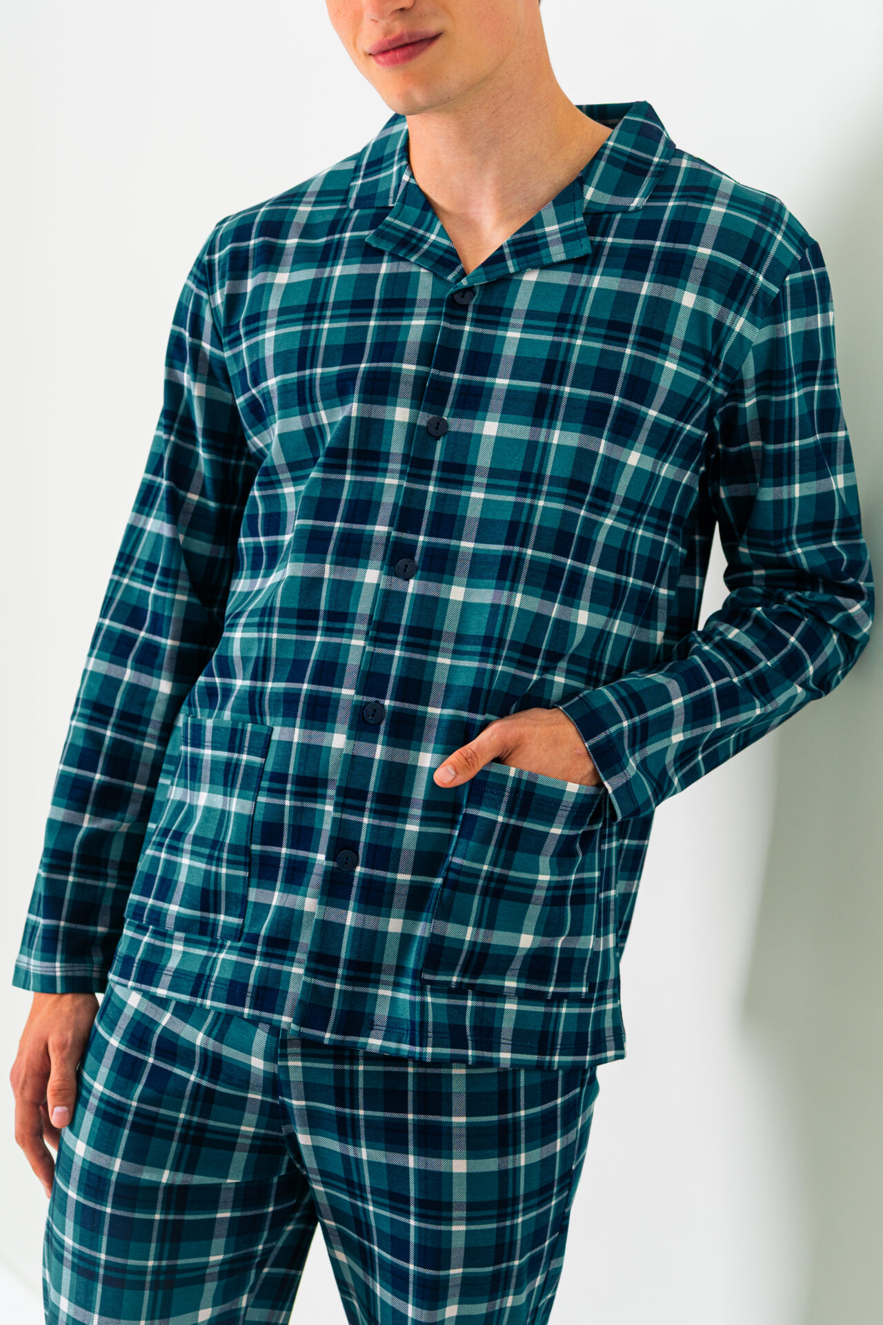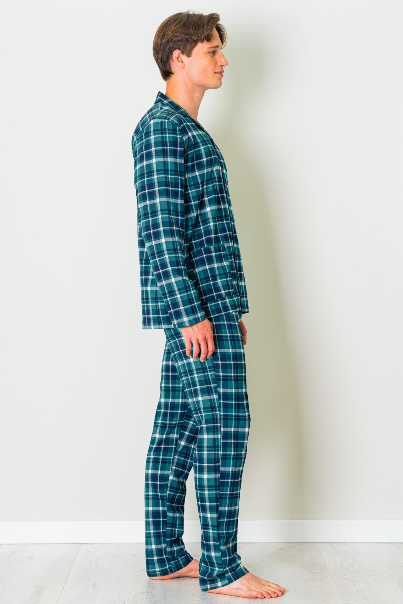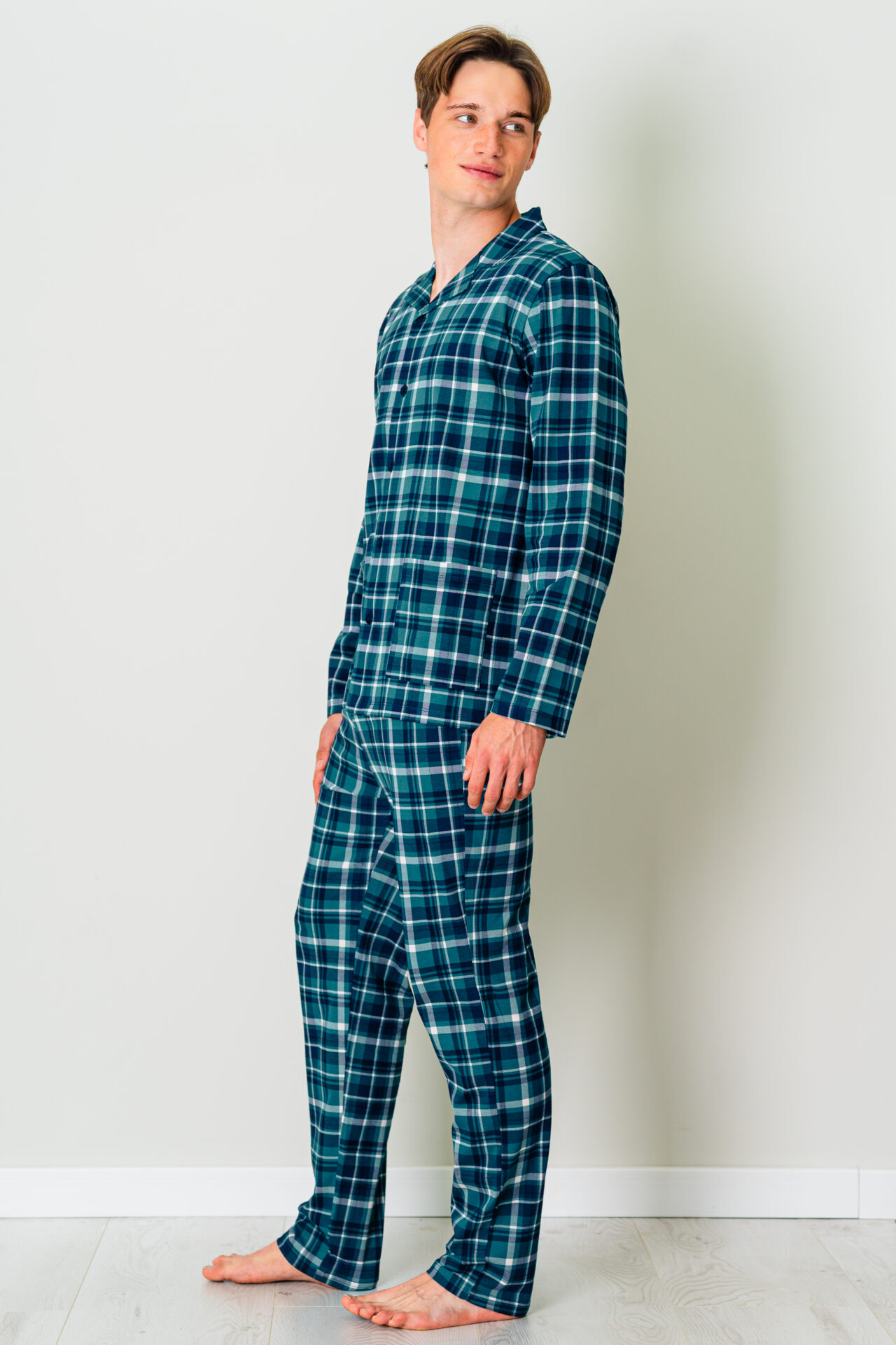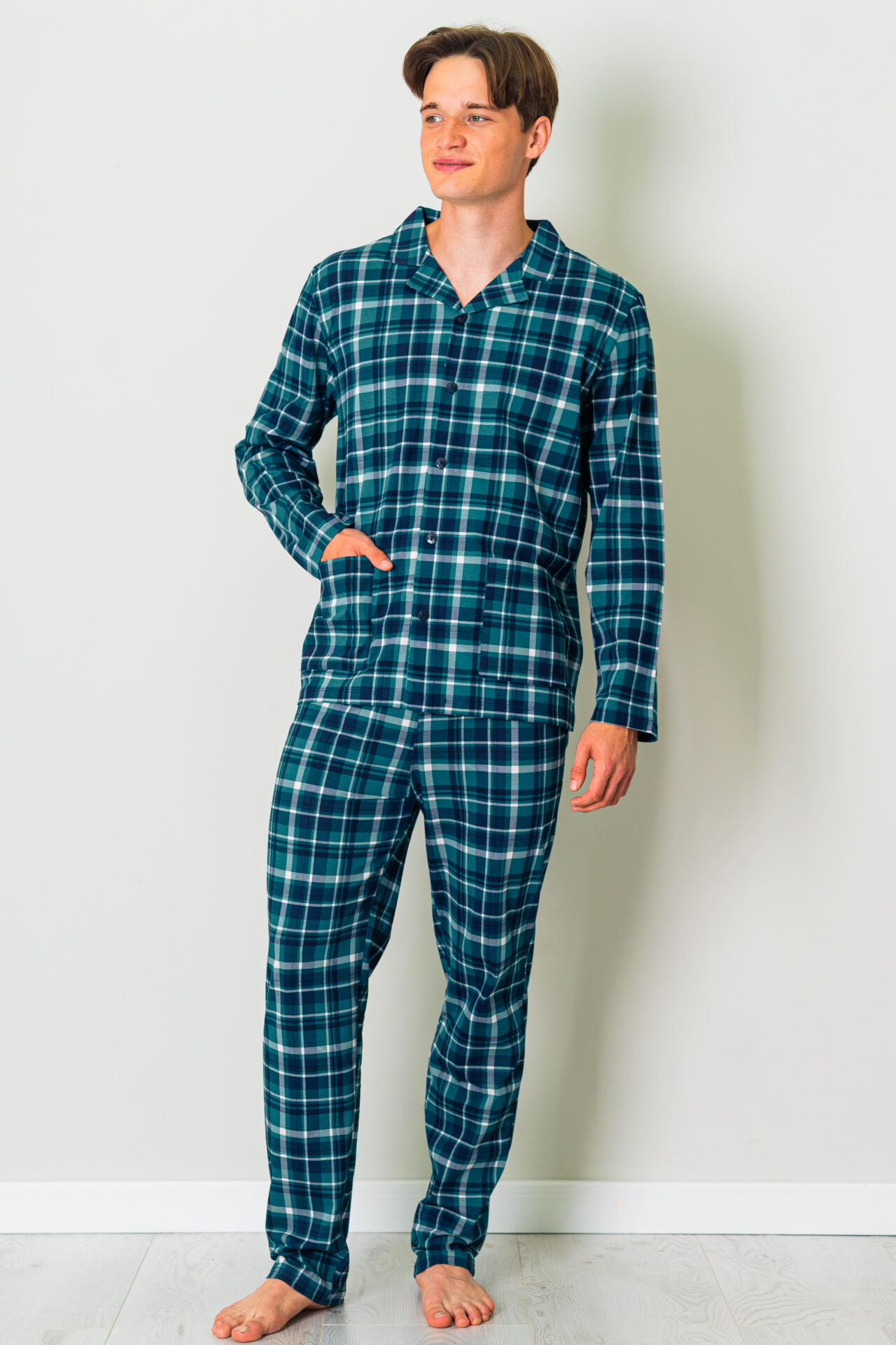 Piżama męska rozpinana w granatowo – zieloną kratę długie spodnie , to piękny klasyczny zestaw do spania. Komplet składa się z długich spodni oraz kraciastej koszuli. Bluzka zapinana na guziki z kieszeniami. Koszula ma wykładany kołnierzyk. Koszula i długie spodnie w kratę. Całość tworzy wygodny, komfortowy i elegancki komplet męski. Ta piżama to również doskonały pomysł na praktyczny prezent. Piżama z bawełny 100%, wykonana z certyfikowanych dzianin. Polski producent