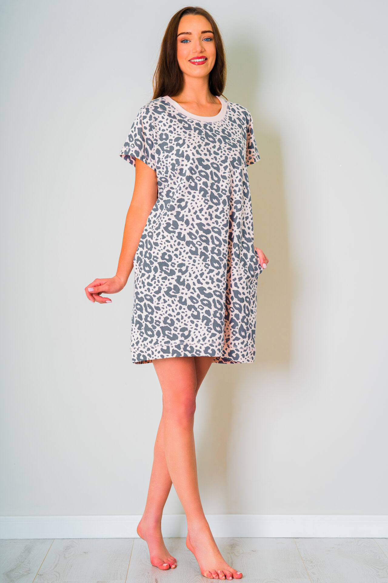 Tunika bawełniana PANTERA z kieszeniami to komfortowy i wygodny krój tuniki do spania. Wygodna tunika na krótki rękaw, z okrągłym dekoltem z kieszeniami. Na tunice nadrukowany jest print PANTERY, który nadaje koszulce dodatkowego uroku. Ponadczasowy nadruk i ciekawy kolor. Tunika sięga przed kolana, dzięki czemu można swobodnie się w niej poruszać,oraz posiada praktyczne kieszenie. Doskonale nadaje się dla każdej kobiety.