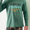 Bluzka z długim rękawem i okrągłym dekoltem. Długie spodnie w całości zadrukowane w zielono-pomarańczową kratkę. Na bluzce nadruk napisem colorado. W tej piżamie możesz chodzić na co dzień. Postaw na wygodę i styl także w domowym zaciszu. Ta męska piżama w odcieniu zieleni została uszyta z miękkiej, oddychającej bawełny, która zapewnia komfort snu oraz swobodę ruchów.